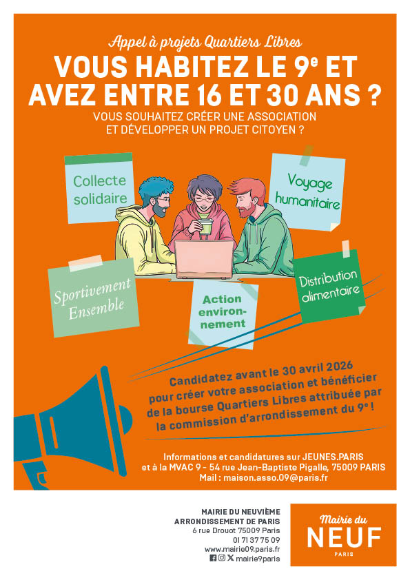 Collecte solidaire, voyage humanitaire, activités sportives, actions environnementales, distribution alimentaire… Candidatez jusqu'au 30 avril 2026pour créer votre association et bénéficier de la bourse "Quartier Libres" qui sera attribuée par la commission de la mairie du 9e arrondissement.