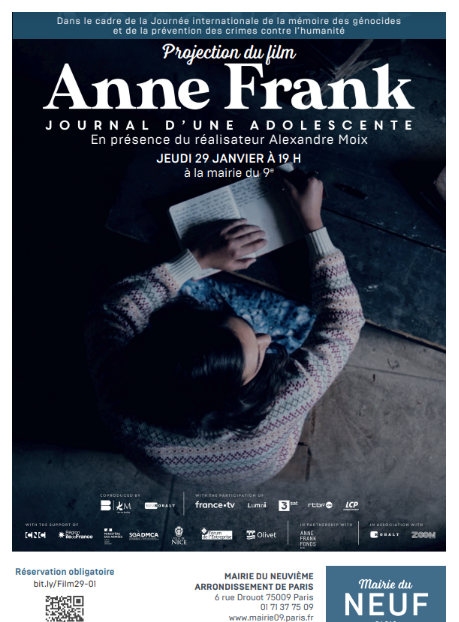 Dans le cadre de la journée internationale de la mémoire des génocides et de la prévention des crimes contre l'humanité, la mairie du 9e vous convie à la projection du film "Anne Franck, journal d'une adolescente" d'Alexandre Moix, suivi d'un échange en présence du réalisateur.